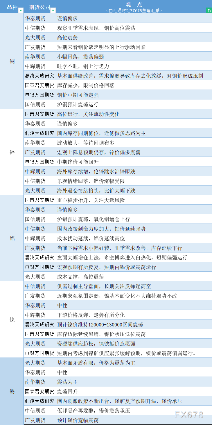 汇通财经APP讯——期货公司不雅点汇总一张图:10月28日有色系(铜、锌、铝、镍、锡等)
